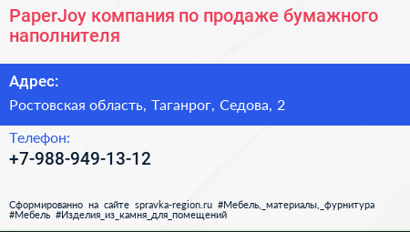 PaperJoy, компания по продаже бумажного наполнителя по адресу Ростовская область, Таганрог, Седова, 2 в дальнейшем Организация, размещена в следующих категориях: