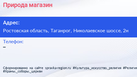 Природа, магазин по адресу Ростовская область, Таганрог, Николаевское шоссе, 2н в дальнейшем Организация, размещена в следующих категориях: