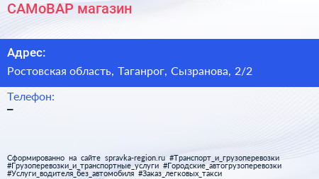 САМоВАР, магазин по адресу Ростовская область, Таганрог, Сызранова, 2/2 в дальнейшем Организация, размещена в следующих категориях: