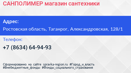 САНПОЛИМЕР, магазин сантехники по адресу Ростовская область, Таганрог, Александровская, 128/1 в дальнейшем Организация, размещена в следующих категориях: