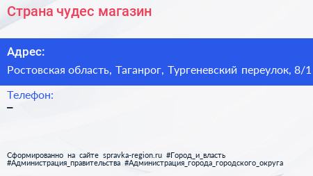Страна чудес, магазин по адресу Ростовская область, Таганрог, Тургеневский переулок, 8/1 в дальнейшем Организация, размещена в следующих категориях: