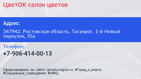 ЦветОК, салон цветов по адресу 347942, Ростовская область, Таганрог, 1-й Новый переулок, 35а в дальнейшем Организация, размещена в следующих категориях: