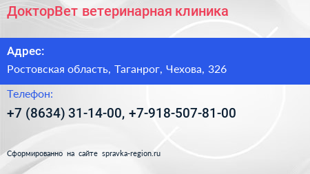 ДокторВет, ветеринарная клиника по адресу Ростовская область, Таганрог, Чехова, 326 в дальнейшем Организация, размещена в следующих категориях: