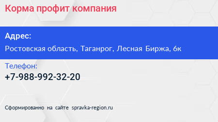 Корма профит, компания по адресу Ростовская область, Таганрог, Лесная Биржа, 6к в дальнейшем Организация, размещена в следующих категориях: