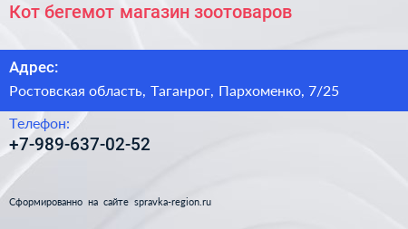 Кот бегемот, магазин зоотоваров по адресу Ростовская область, Таганрог, Пархоменко, 7/25 в дальнейшем Организация, размещена в следующих категориях: