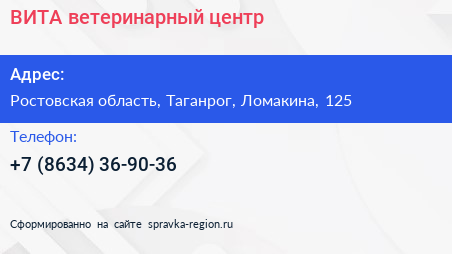 ВИТА, ветеринарный центр по адресу Ростовская область, Таганрог, Ломакина, 125 в дальнейшем Организация, размещена в следующих категориях: