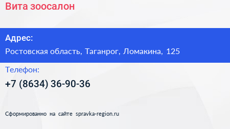 Вита, зоосалон по адресу Ростовская область, Таганрог, Ломакина, 125 в дальнейшем Организация, размещена в следующих категориях: