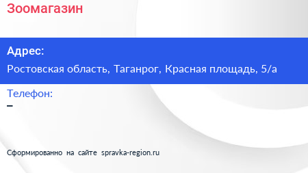 Зоомагазин по адресу Ростовская область, Таганрог, Красная площадь, 5/а в дальнейшем Организация, размещена в следующих категориях:
