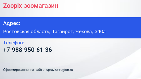 Zoopix, зоомагазин по адресу Ростовская область, Таганрог, Чехова, 340а в дальнейшем Организация, размещена в следующих категориях: