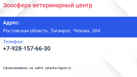 Зоосфера, ветеринарный центр по адресу Ростовская область, Таганрог, Чехова, 264 в дальнейшем Организация, размещена в следующих категориях: