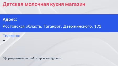 Детская молочная кухня, магазин по адресу Ростовская область, Таганрог, Дзержинского, 191 в дальнейшем Организация, размещена в следующих категориях: