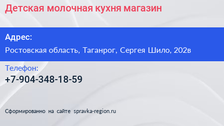Детская молочная кухня, магазин по адресу Ростовская область, Таганрог, Сергея Шило, 202в в дальнейшем Организация, размещена в следующих категориях: