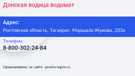 Донская водица, водомат по адресу Ростовская область, Таганрог, Маршала Жукова, 223а в дальнейшем Организация, размещена в следующих категориях:
