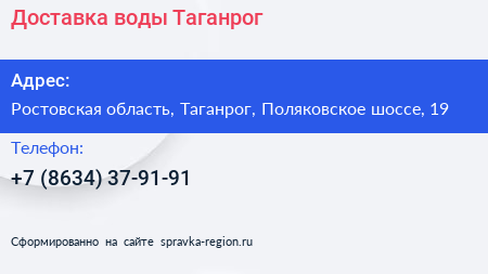 Доставка воды Таганрог по адресу Ростовская область, Таганрог, Поляковское шоссе, 19 в дальнейшем Организация, размещена в следующих категориях: