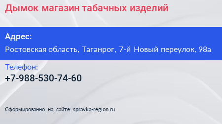 Дымок, магазин табачных изделий по адресу Ростовская область, Таганрог, 7-й Новый переулок, 98а в дальнейшем Организация, размещена в следующих категориях: