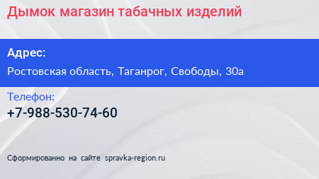 Дымок, магазин табачных изделий по адресу Ростовская область, Таганрог, Свободы, 30а в дальнейшем Организация, размещена в следующих категориях: