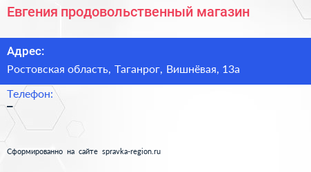 Евгения, продовольственный магазин по адресу Ростовская область, Таганрог, Вишнёвая, 13а в дальнейшем Организация, размещена в следующих категориях: