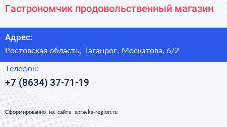 Гастрономчик, продовольственный магазин по адресу Ростовская область, Таганрог, Москатова, 6/2 в дальнейшем Организация, размещена в следующих категориях: