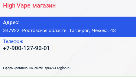 High Vape, магазин по адресу 347922, Ростовская область, Таганрог, Чехова, 43 в дальнейшем Организация, размещена в следующих категориях: