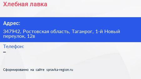 Хлебная лавка по адресу 347942, Ростовская область, Таганрог, 1-й Новый переулок, 12в в дальнейшем Организация, размещена в следующих категориях:
