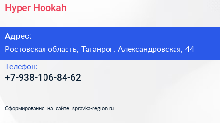 Hyper Hookah по адресу Ростовская область, Таганрог, Александровская, 44 в дальнейшем Организация, размещена в следующих категориях:
