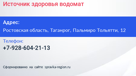 Источник здоровья, водомат по адресу Ростовская область, Таганрог, Пальмиро Тольятти, 12 в дальнейшем Организация, размещена в следующих категориях: