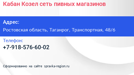 Кабан & Козел, сеть пивных магазинов по адресу Ростовская область, Таганрог, Транспортная, 48/6 в дальнейшем Организация, размещена в следующих категориях: