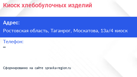Киоск хлебобулочных изделий по адресу Ростовская область, Таганрог, Москатова, 13а/4 киоск в дальнейшем Организация, размещена в следующих категориях: