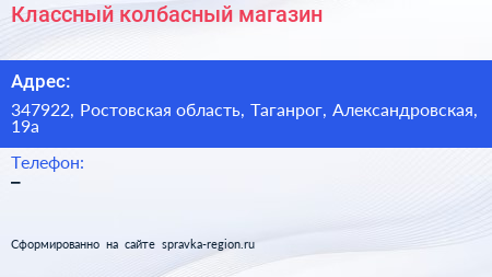 Классный-колбасный, магазин по адресу 347922, Ростовская область, Таганрог, Александровская, 19а в дальнейшем Организация, размещена в следующих категориях: