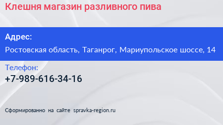 Клешня, магазин разливного пива по адресу Ростовская область, Таганрог, Мариупольское шоссе, 14 в дальнейшем Организация, размещена в следующих категориях: