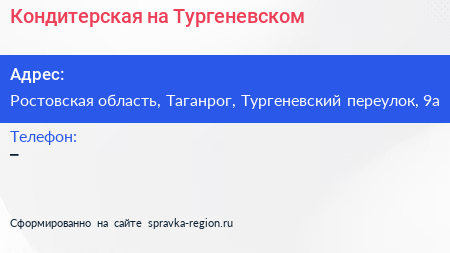 Кондитерская на Тургеневском по адресу Ростовская область, Таганрог, Тургеневский переулок, 9а в дальнейшем Организация, размещена в следующих категориях: