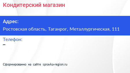 Кондитерский магазин по адресу Ростовская область, Таганрог, Металлургическая, 111 в дальнейшем Организация, размещена в следующих категориях:
