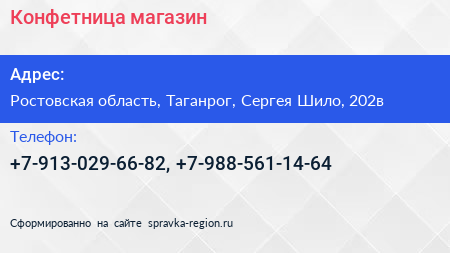 Конфетница, магазин по адресу Ростовская область, Таганрог, Сергея Шило, 202в в дальнейшем Организация, размещена в следующих категориях:
