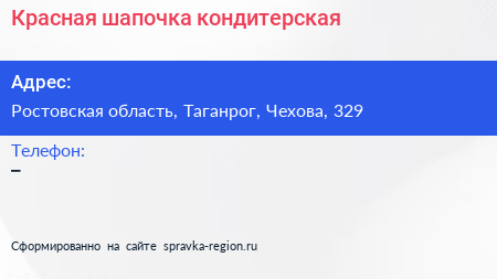 Красная шапочка, кондитерская по адресу Ростовская область, Таганрог, Чехова, 329 в дальнейшем Организация, размещена в следующих категориях: