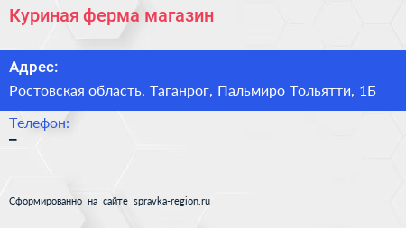 Куриная ферма, магазин по адресу Ростовская область, Таганрог, Пальмиро Тольятти, 1Б в дальнейшем Организация, размещена в следующих категориях:
