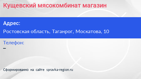 Кущевский мясокомбинат, магазин по адресу Ростовская область, Таганрог, Москатова, 10 в дальнейшем Организация, размещена в следующих категориях: