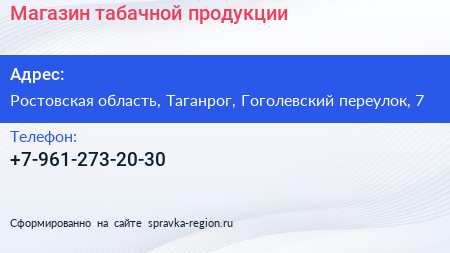 Магазин табачной продукции по адресу Ростовская область, Таганрог, Гоголевский переулок, 7 в дальнейшем Организация, размещена в следующих категориях: