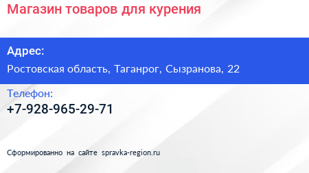 Магазин товаров для курения по адресу Ростовская область, Таганрог, Сызранова, 22 в дальнейшем Организация, размещена в следующих категориях: