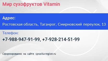 Мир сухофруктов Vitamin по адресу Ростовская область, Таганрог, Смирновский переулок, 13 в дальнейшем Организация, размещена в следующих категориях:
