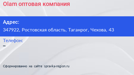 Olam, оптовая компания по адресу 347922, Ростовская область, Таганрог, Чехова, 43 в дальнейшем Организация, размещена в следующих категориях: