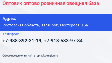 Оптовик, оптово-розничная овощная база по адресу Ростовская область, Таганрог, Нестерова, 15а в дальнейшем Организация, размещена в следующих категориях: