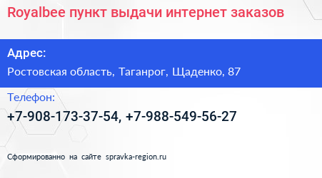 Royalbee, пункт выдачи интернет-заказов по адресу Ростовская область, Таганрог, Щаденко, 87 в дальнейшем Организация, размещена в следующих категориях: