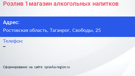 Розлив №1, магазин алкогольных напитков по адресу Ростовская область, Таганрог, Свободы, 25 в дальнейшем Организация, размещена в следующих категориях:
