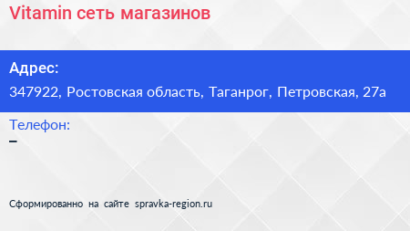 Vitamin, сеть магазинов по адресу 347922, Ростовская область, Таганрог, Петровская, 27а в дальнейшем Организация, размещена в следующих категориях: