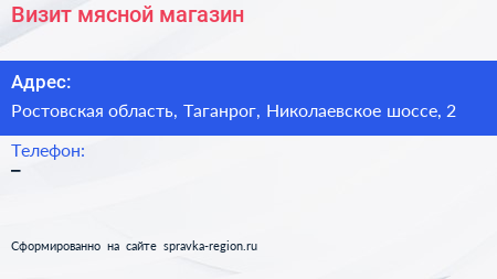 Визит, мясной магазин по адресу Ростовская область, Таганрог, Николаевское шоссе, 2 в дальнейшем Организация, размещена в следующих категориях:
