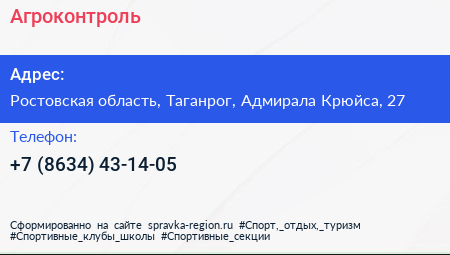Агроконтроль по адресу Ростовская область, Таганрог, Адмирала Крюйса, 27 в дальнейшем Организация, размещена в следующих категориях: