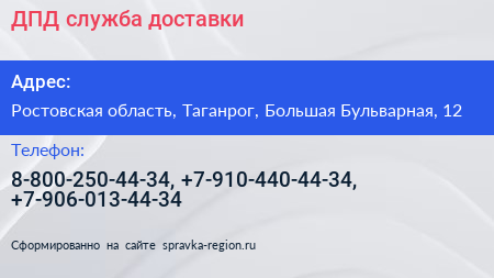 ДПД, служба доставки по адресу Ростовская область, Таганрог, Большая Бульварная, 12 в дальнейшем Организация, размещена в следующих категориях: