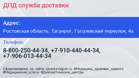 ДПД, служба доставки по адресу Ростовская область, Таганрог, Гоголевский переулок, 4а в дальнейшем Организация, размещена в следующих категориях:
