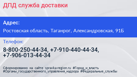 ДПД, служба доставки по адресу Ростовская область, Таганрог, Александровская, 91Б в дальнейшем Организация, размещена в следующих категориях: