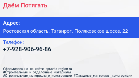 Даём Потягать по адресу Ростовская область, Таганрог, Поляковское шоссе, 22 в дальнейшем Организация, размещена в следующих категориях: